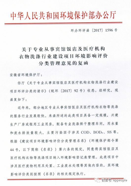關(guān)于專業(yè)從事賓館飯店及醫(yī)療機構(gòu)衣物洗滌行業(yè)建設(shè)項目環(huán)境影響評價分類管理意見的復(fù)函
