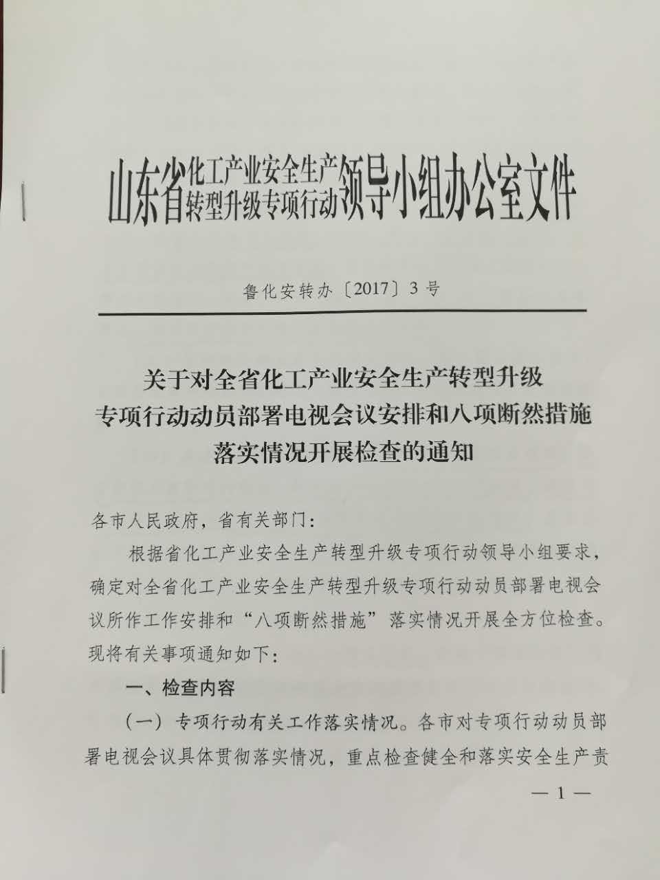 關(guān)于對全省化工產(chǎn)業(yè)安全生產(chǎn)轉(zhuǎn)型升級專項(xiàng)行動動員部署電視會議安排和八項(xiàng)斷然措施落實(shí)情況開展檢查的通知